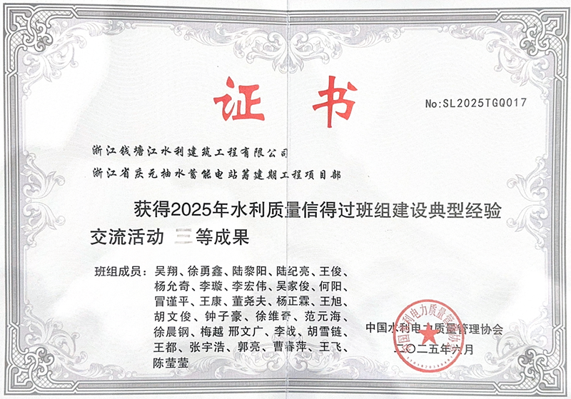 近日,中國水利電力質量管理協會公布2025年度水利質量信得過班組建設典型經驗交流活動評選結果,慶元抽蓄籌建期EPC總承包項目憑借扎實有效的質量管理實踐和突出的建設成果,榮獲“2025年水利質量信得過班組建設典型經驗交流活動”三等成果。這一榮譽不僅為“浙錢水建”品牌再添光彩,更標志著公司在工程質量管理領域獲得了行業權威機構的高度認可。